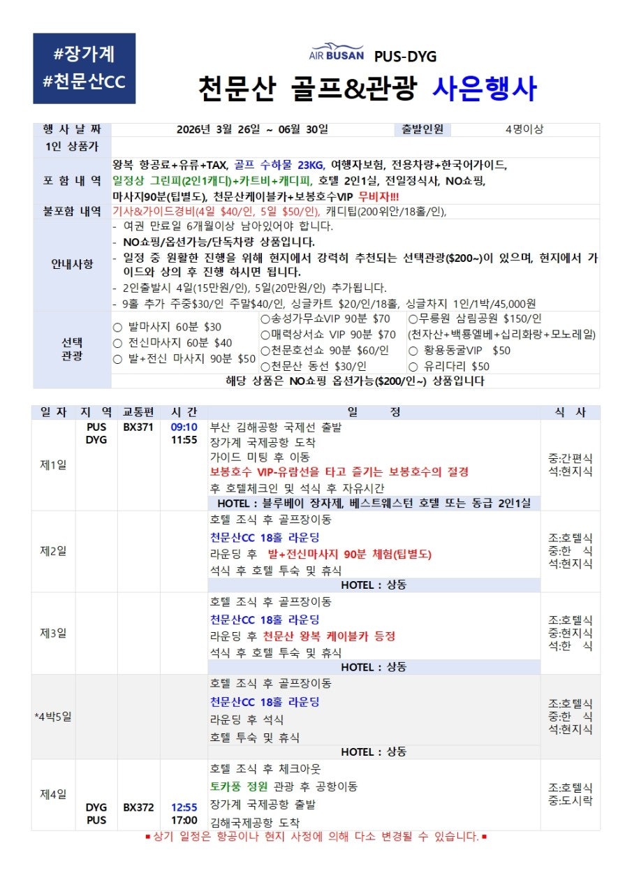 ±â»ç&°¡ÀÌµå°æºñ(4ÀÏ $40/ÀÎ, 5ÀÏ $50/ÀÎ), ijµðÆÁ(150À§¾È/18Ȧ/ÀÎ),